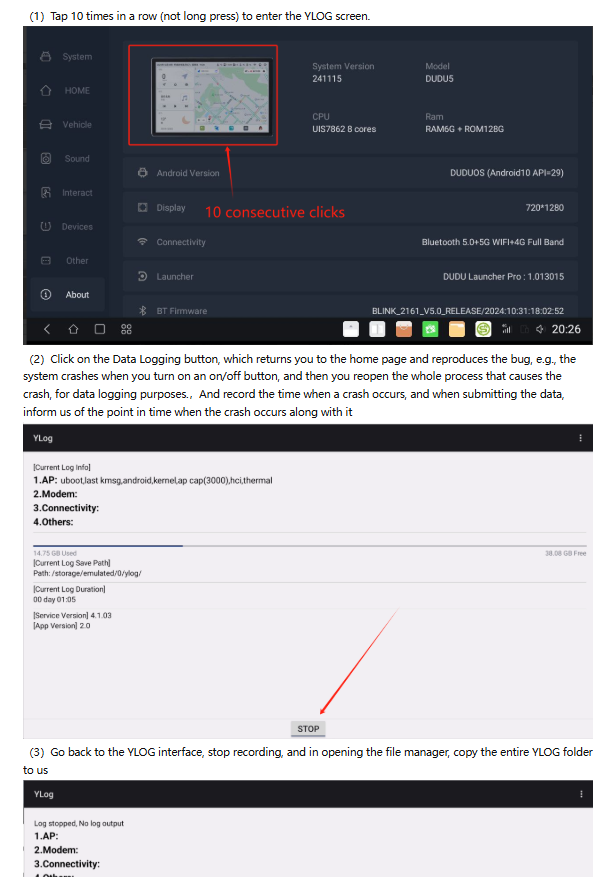 DUDU-Meng mircondini This is the method for capturing ylog. https://forum.dudu-auto.com/d/1674-important-notice-feedback-on-bugs-must-be-prepared-system-information https://forum.dudu-auto.com/d/14-how-to-give-correct-feedback-on-bugs