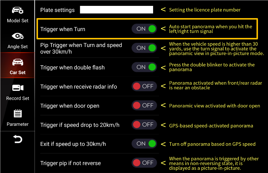 For the turning issue, I have set ‘Trigger when turn’ , ‘Pip trigger when turn and speed over 30km/h’, ‘Trigger pip if not reverse’